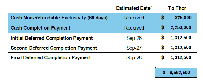 Three additional payments totalling A$3,937,500 due between September 2026 and September 2028, bringing total sale proceeds to Thor of A$6,562,50